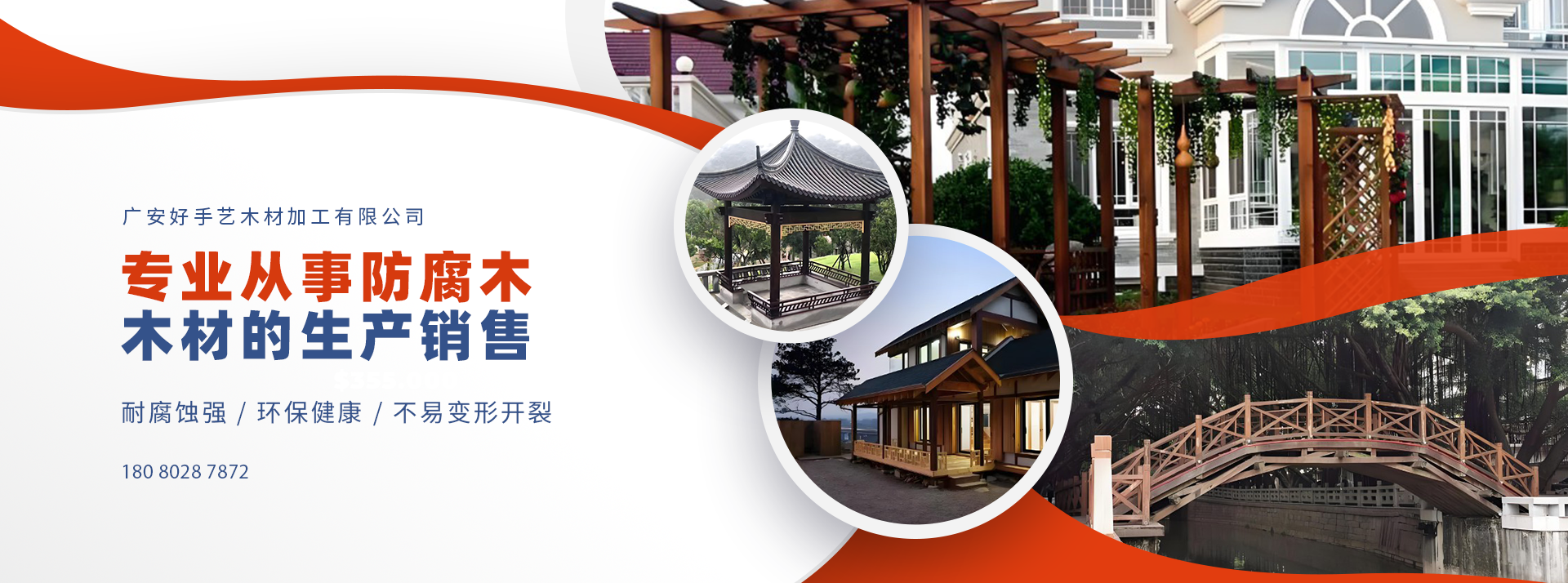 廣安好手藝木材加工有限公司專業從事防腐木木材的生產及銷售,企業立足防腐木材生產、銷售、設計、咨詢為一體的綜合性企業,產品包括:戶外防腐木亭子、防腐木木屋、花架、欄桿、花箱、防腐木地板、寵物屋、休閑椅、公園椅、景觀長廊、環衛垃圾桶,秋千等公共配套設施的生產、銷售、安裝。 公司擁有一批從事木材研究的技術人,及精良的安裝施工隊伍,現代化的生產設備。經過風雨歷練,積累了大量的采購、開發、研究生產、銷售、安裝防腐木材的豐富經驗。 產品可廣泛應用于公共休閑場所、湖邊棧道、旅游景點、戶外